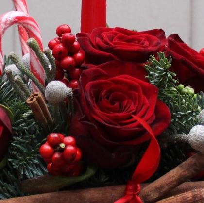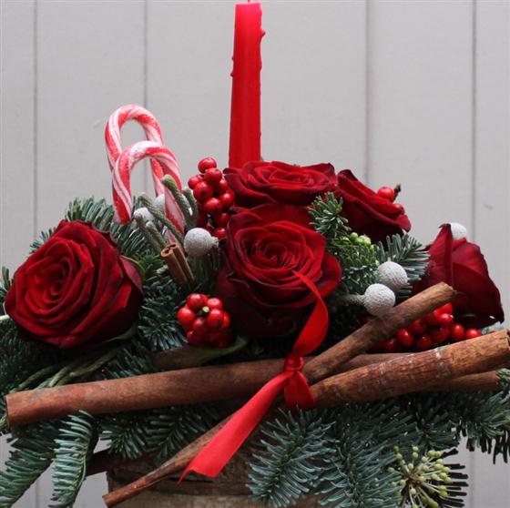 This classically elegant table arrangement of seasonal flowers & foliage makes a beautiful addition to your home this Christmas.