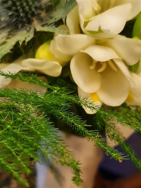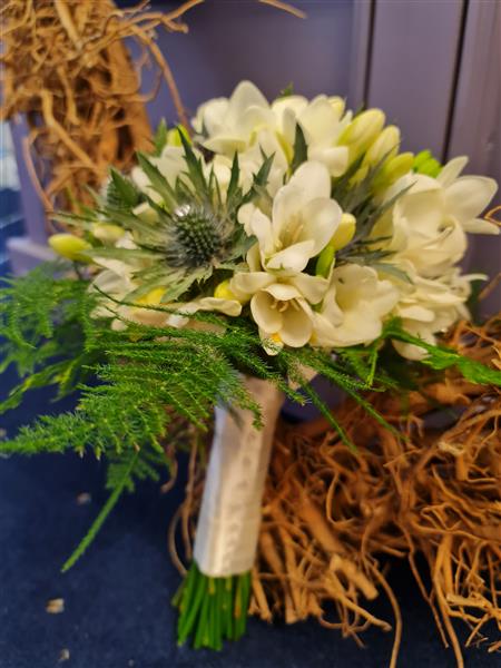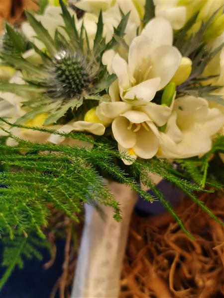 All white Freesia with blue thistle and asparagus fern wrapped in Satin with pearl pins