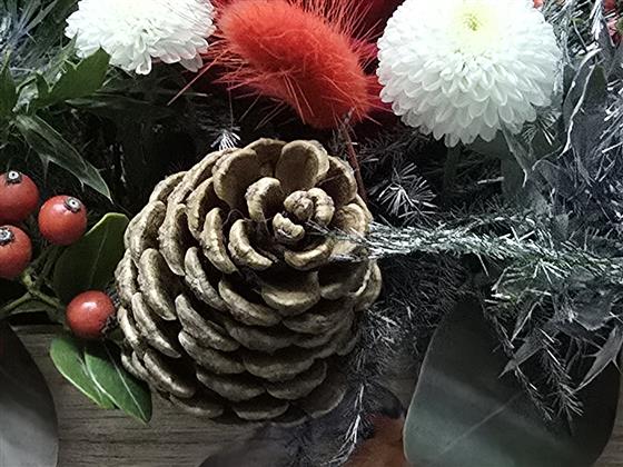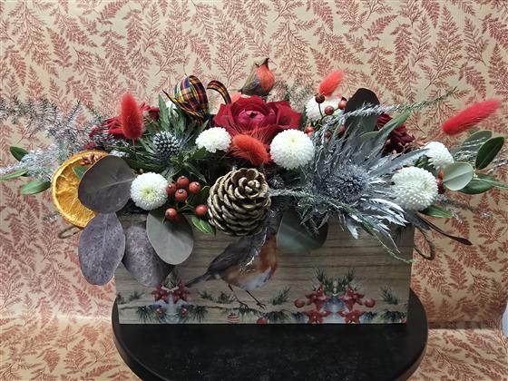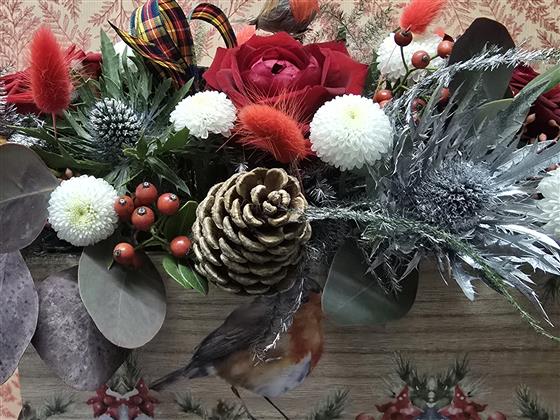 Beautiful Christmas red roses, Thistles mixed foliage tartan bow with a sweet Robin sat on top.
