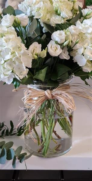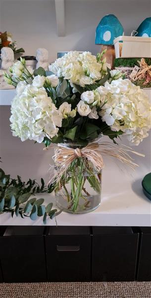 White hydrangae white lisianthus eucalyptus with raffia bow